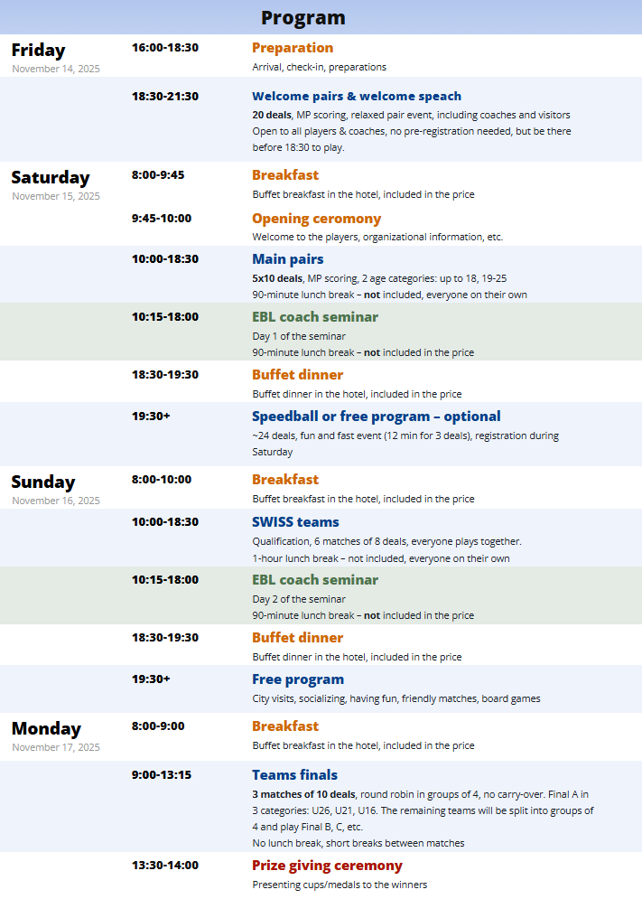 3 matches of 10 deals, round robin in groups of 4, no carry-over. Final A in 3 categories: U26, U21, U16. The remaining teams will be split into groups of 4 and play Final B, C, etc.