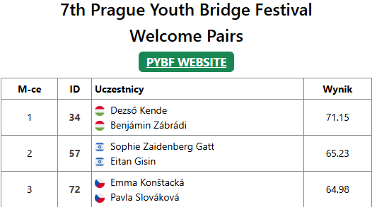 20 deals, MP scoring, relaxed pair event, including coaches and visitors